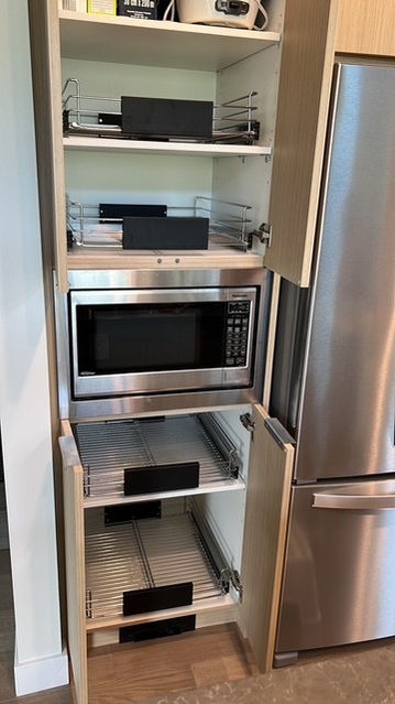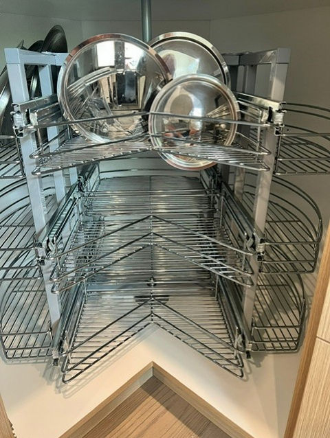Four stainless steel cabinet pullouts and stainless corner storage solution with drawers in kitchen